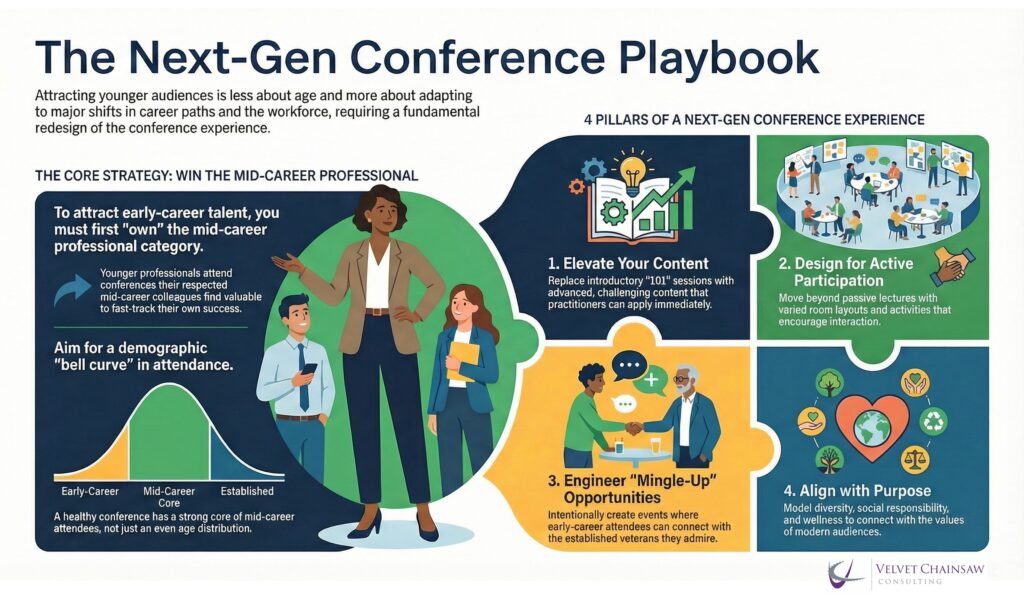 Attracting NextGen attendees continues to be a top priority for conference and trade show organizers. What we’ve learned is that success has less to do with age and more to do with shifting workforce dynamics and rising expectations for practical, immediate value. Conferences that emphasize relevant learning, intentional networking, and flexible engagement are seeing stronger results.